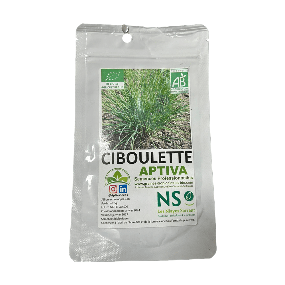 Semences de Ciboulette Bio en sachet de 5g. Plante aromatique douce et légèrement oignon, parfaite pour vos plats. Facile à cultiver, culture bio garantie.